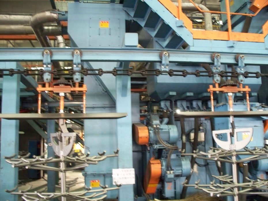 g、分別啟動(dòng)各個(gè)機(jī)構(gòu),檢查拋頭、鐵丸輸送系統(tǒng)、輔助鏈和懸鏈的運(yùn)動(dòng)情況,確認(rèn)一切正常后,方可進(jìn)行生產(chǎn)。